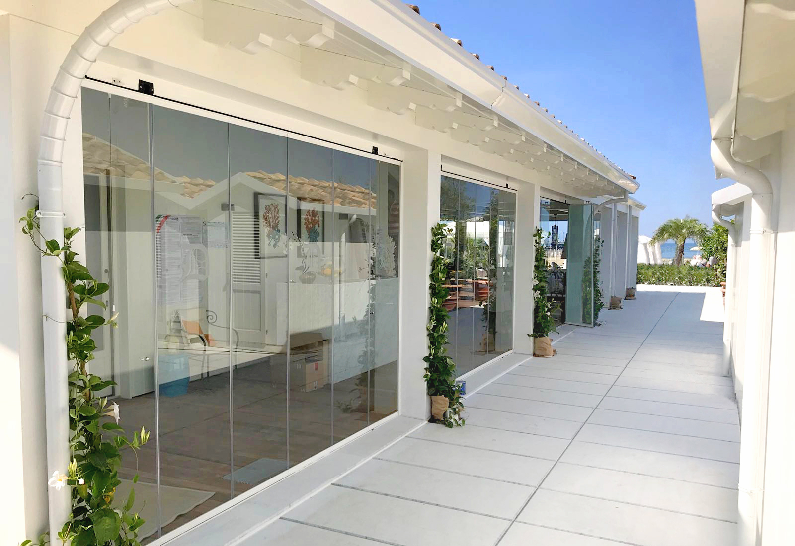 Ideali per pergole, terrazzi, verande e spazi commerciali, le vetrate tutto vetro offrono protezione dagli agenti atmosferici, massima trasparenza e un design moderno in grado di valorizzare qualsiasi ambiente.